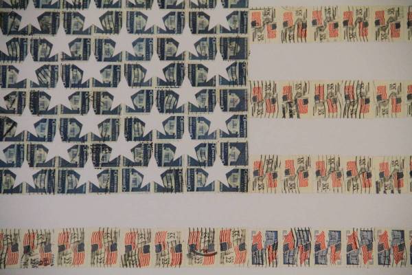 Vintage / collectable stamp art collages of the USA Flag. Solid cherry wood frame. Dimensions: 39"L x 25"W. 2 designs available. $100 each, or 2 for $150.