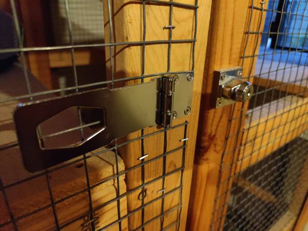 All three sides and far lower half have square mesh. Comes in two pieces for easy transport, and connects left side with included hinges. Built for covered porch (not stained). Opening on far side - top half. You PU, I will be able to lift one end. My porch is same height as most tailgates.