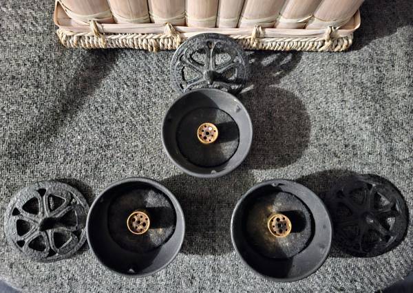 Incense Burners with Holders, etc. Cast Iron Incense Burners with Holders Ideal for Sticks, Cone & Resin Incense. Includes full case of Sandal Incense Cones. Also includes Iron Swivel Bell...