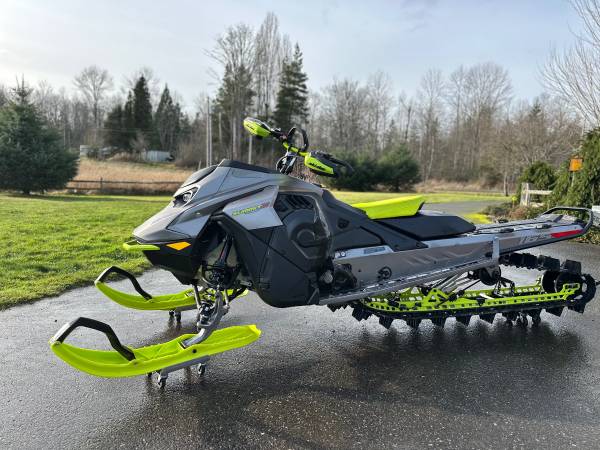 Fire sale and the snow is stacking up already! 2023 Ski Doo Summit Expert Turbo R 165. 1,602 miles with full factory B.E.S.T warranty through 12/27/2025! All updates have been done at the dealer including HYVO chain/gears and rave valve service. I ran fox shocks so the factory shocks are back on and brand new never seen snow. Bone stock and always well maintained, clutches blown out and kept clean, new reeds at 1,400mi, and fresh chain case oil. Also has a clutch panel vent cover, tunnel protector + 2 sets of LINQ brackets already installed for Jerri cans or tunnel bag, and SHOT Start. Tie rod boots are both good, track is great no torn lugs this thing is ready to ride just add oil and gas!