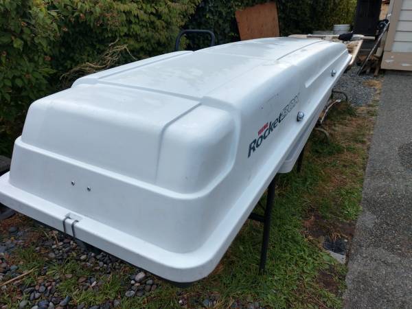 * Yakima Large Rooftop Cargo Box, the Rocketbox XL model, 18cuft . Fits ALL bar types. The absolute best way to hold skis, snowboards, dufflebags, backpacks, suitcases, etc. 549 firm. Color: white.